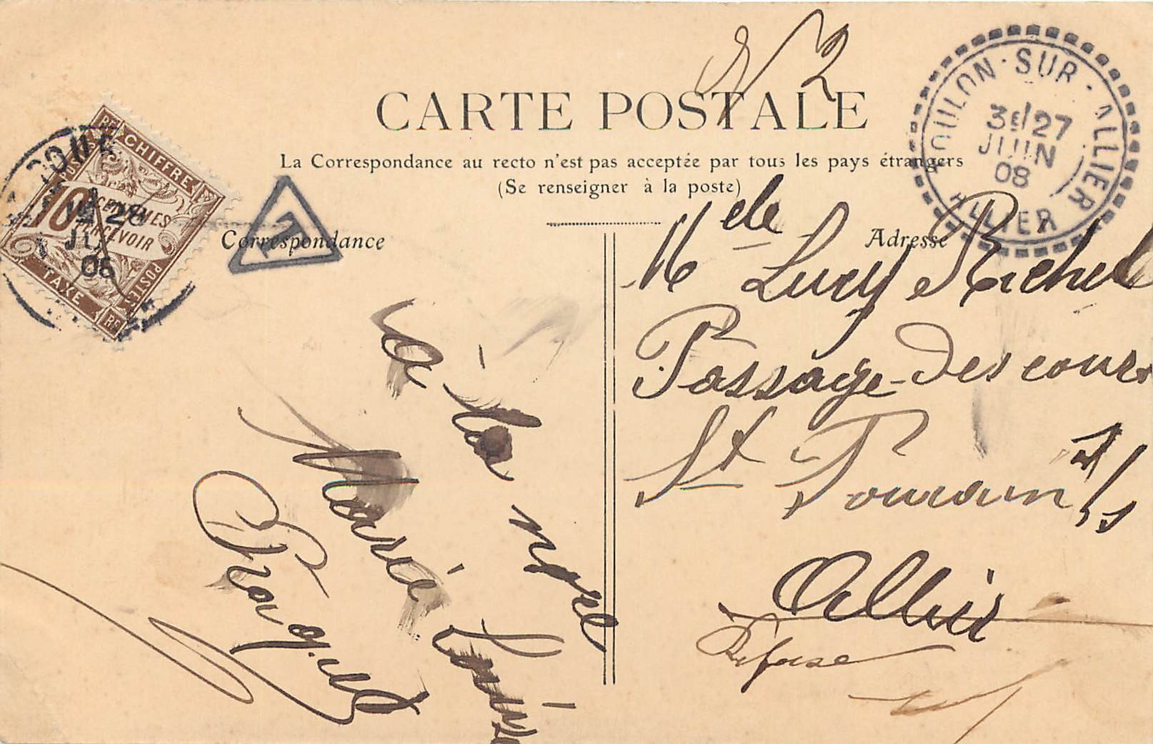 03 TOULON-SUR-ALLIER. Marchefer Route de Moulins. Timbre taxe 1908
