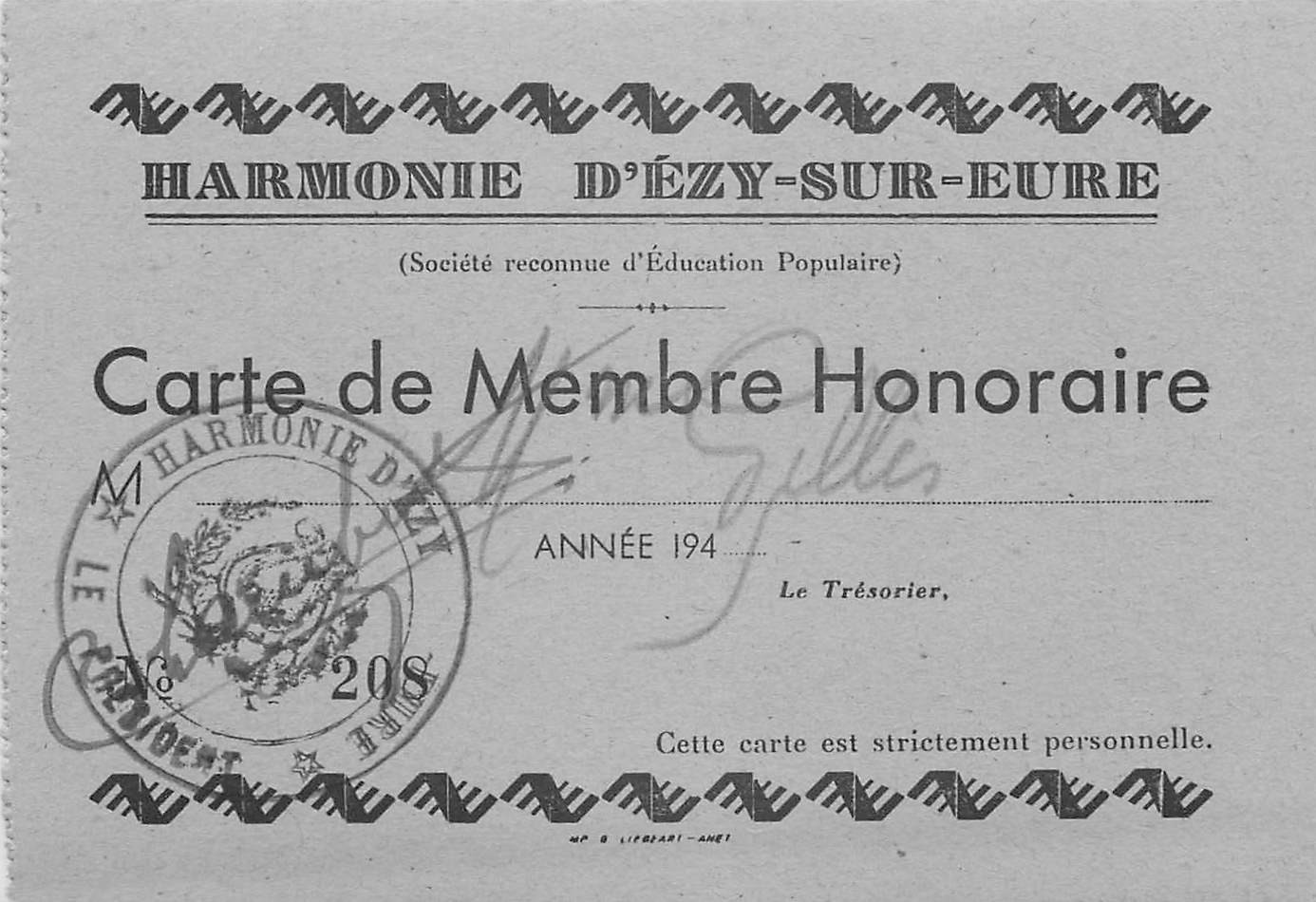 27 EZY. Photo Charlène Coiffure + Ticket Carte de Membre Harmonie Ezy-sur-Eure 1945