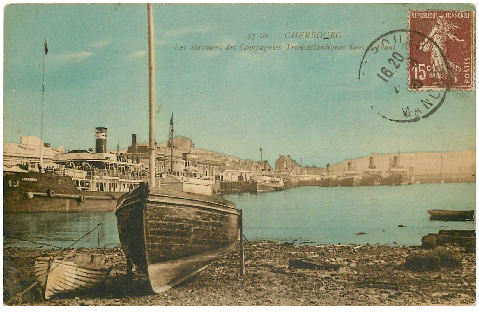 carte postale ancienne 50 CHERBOURG. Steamers Compagniers Transatlantiques et Barque de Pêcheurs dans le Port 1930 - Scanne et information sur demande. - les cartes postales vendues sur la boutique sont des orginales.Destinataire :