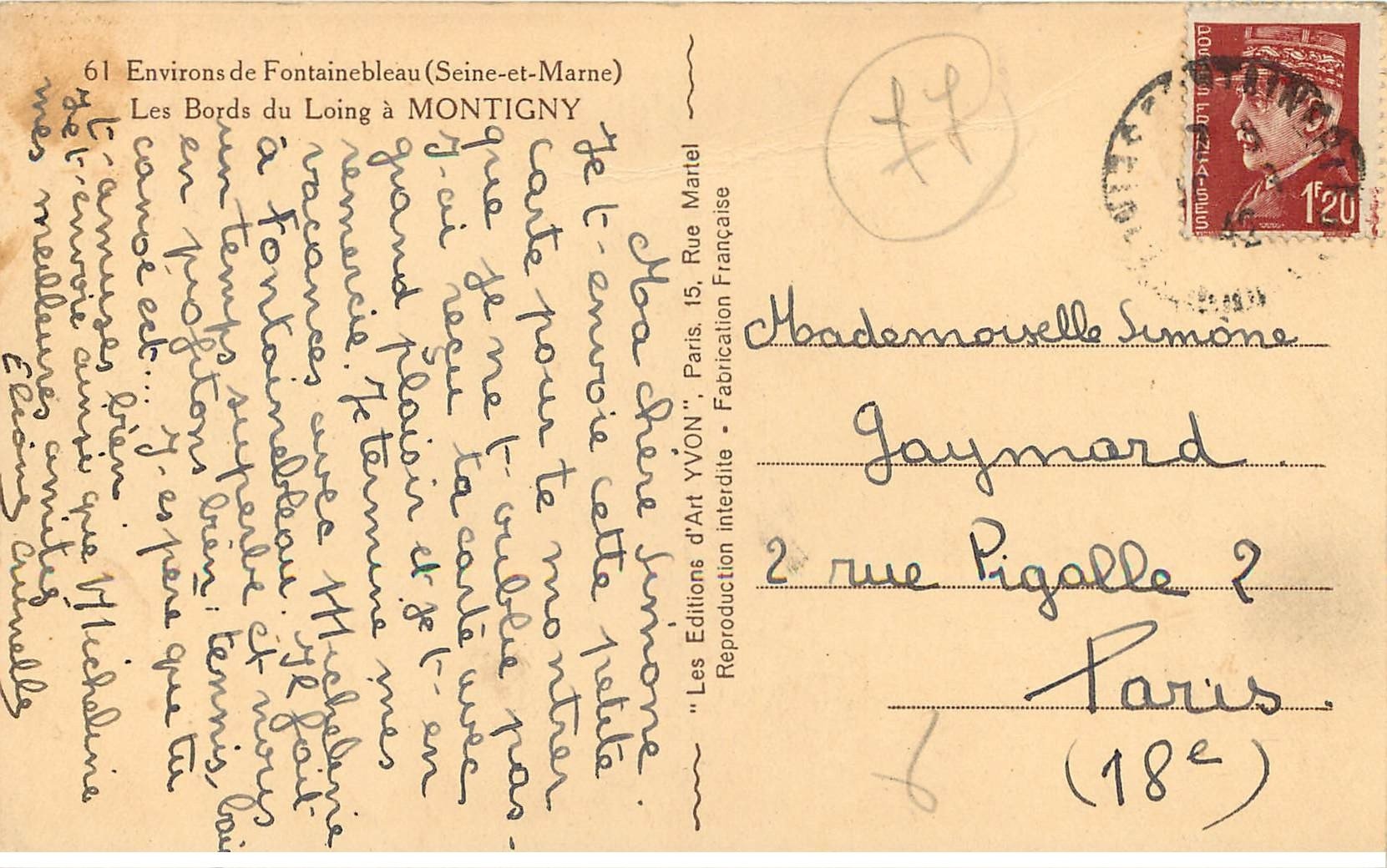 carte postale ancienne 77 MONTIGNY. Les Bords du Loing 1942 - Scanne et information sur demande. - les cartes postales vendues sur la boutique sont des orginales.Destinataire :