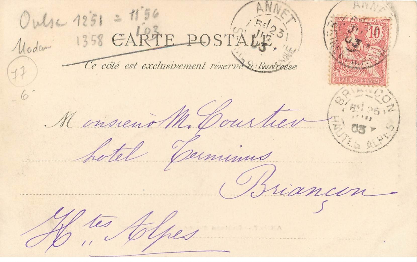carte postale ancienne K. 77 ANNET. Château d'Etry 1903 - Scanne et information sur demande. - les cartes postales vendues sur la boutique sont des orginales.Destinataire :