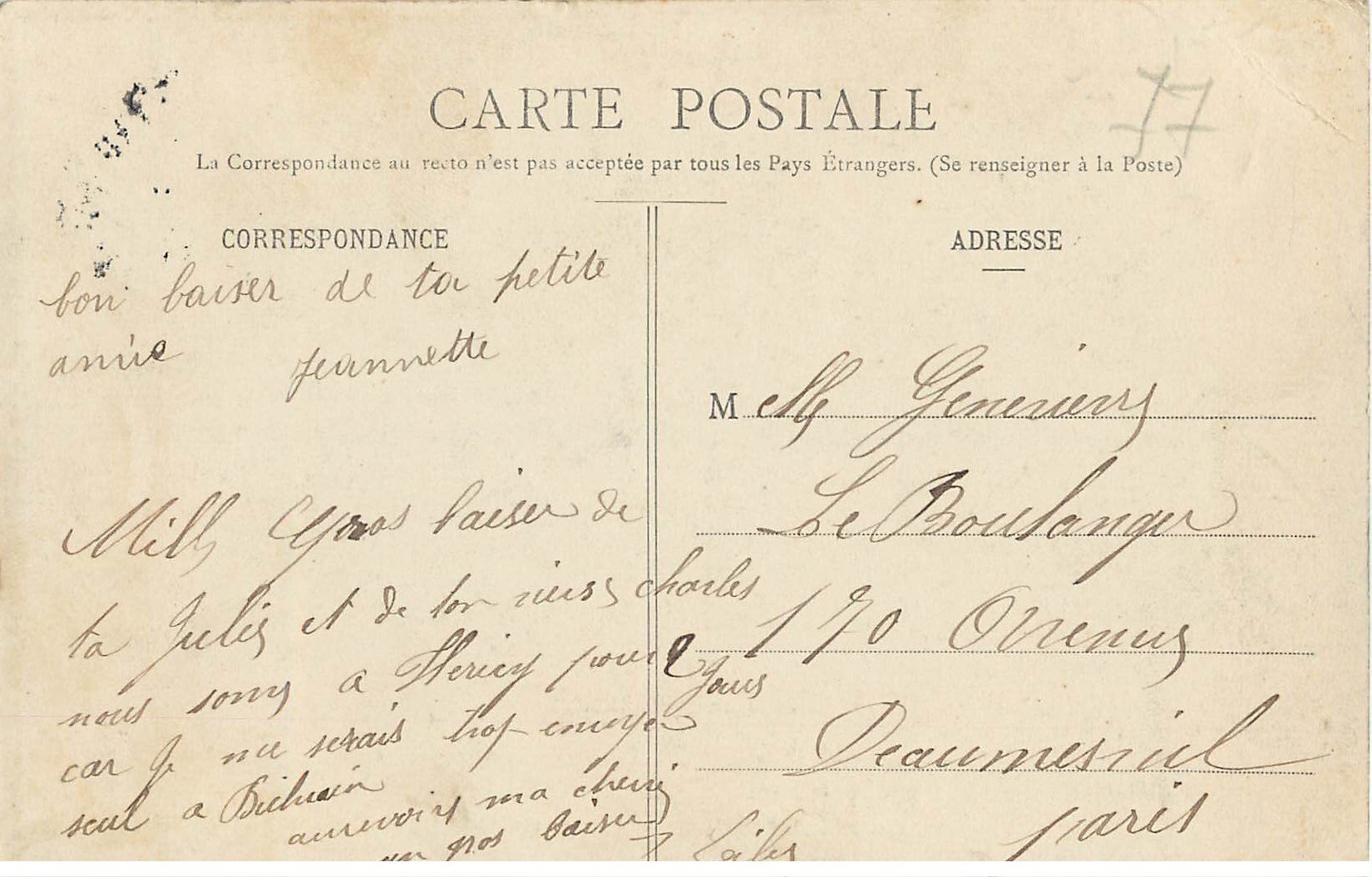 carte postale ancienne 77 HERICY. La Rue 1913. Epicerie Pommier, Buvette Boulangerie Pâtisserie - Scanne et information sur demande. Très très finement déliassée bord droit - les cartes postales vendues sur la boutique sont des orginales.Destinataire :