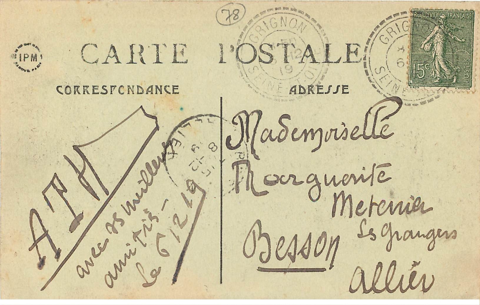 carte postale ancienne 78 GRIGNON. Ecole Nationale Agriculture. Château 1919 - Scanne et information sur demande. - les cartes postales vendues sur la boutique sont des orginales.Destinataire :