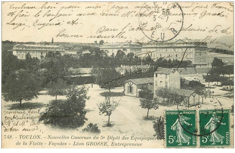 carte postale ancienne 83 TOULON. Caserne du 5 Dépôt d'Equipage de la Flotte 1909 Scanne et information sur demande. Les cartes postales vendues sur la boutique sont des orginales.Destinataire :