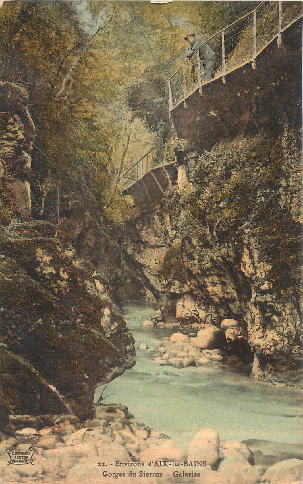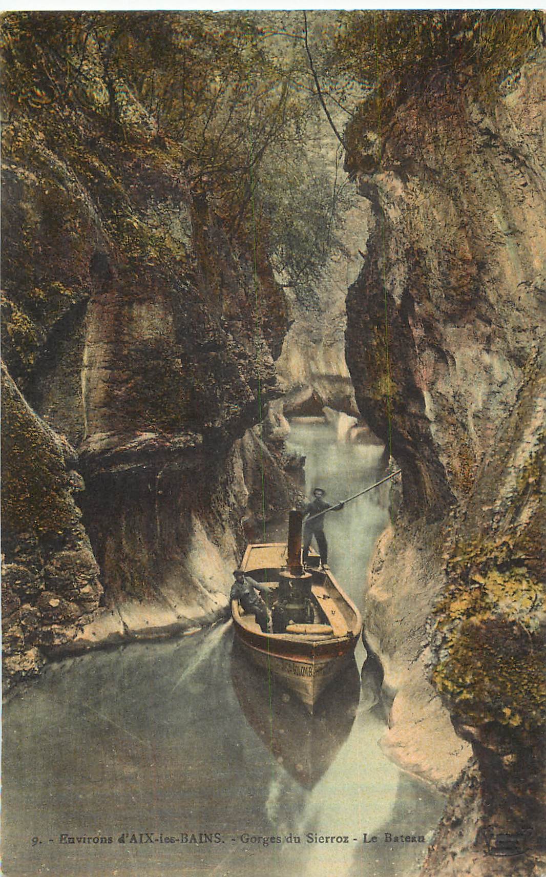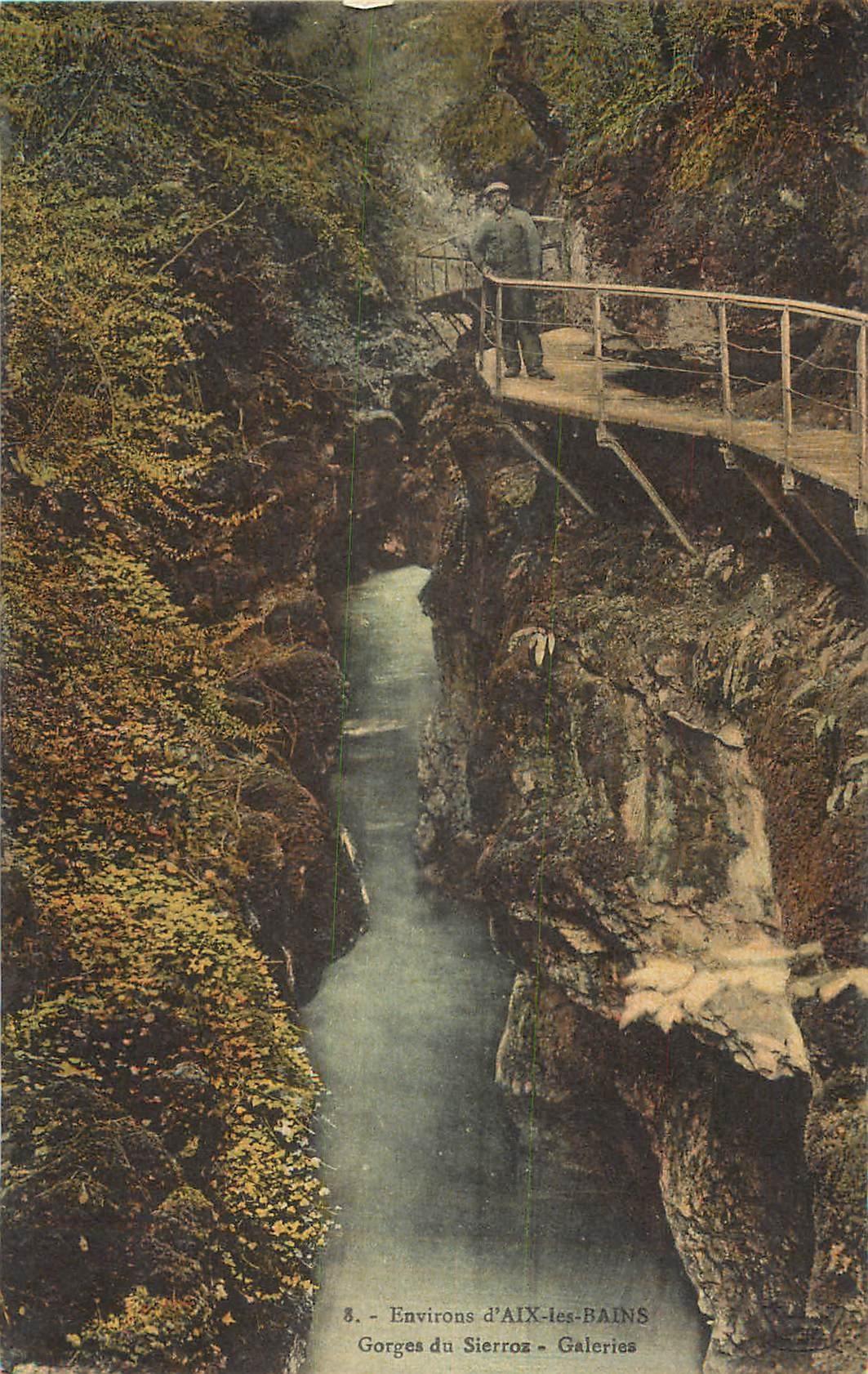 3 cpa environs 73 AIX-LES-BAINS. Gorges du Sierroz Galeries et bateau animation sur les parois