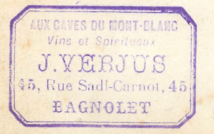93 Rare Bagnolet. Aux Caves du Mont-Blanc 45 rue Sadi Carnot tenues par Verjus 1906