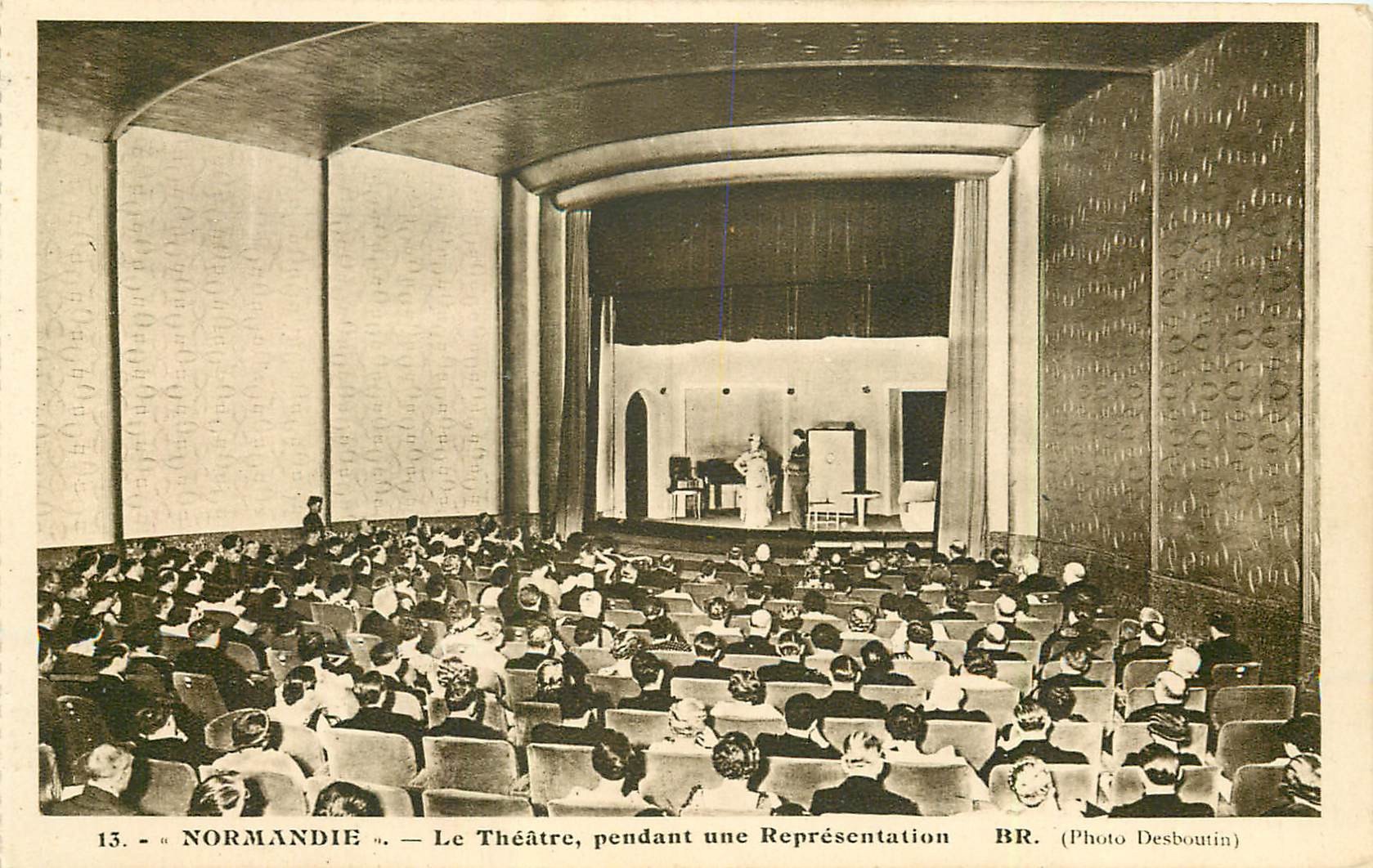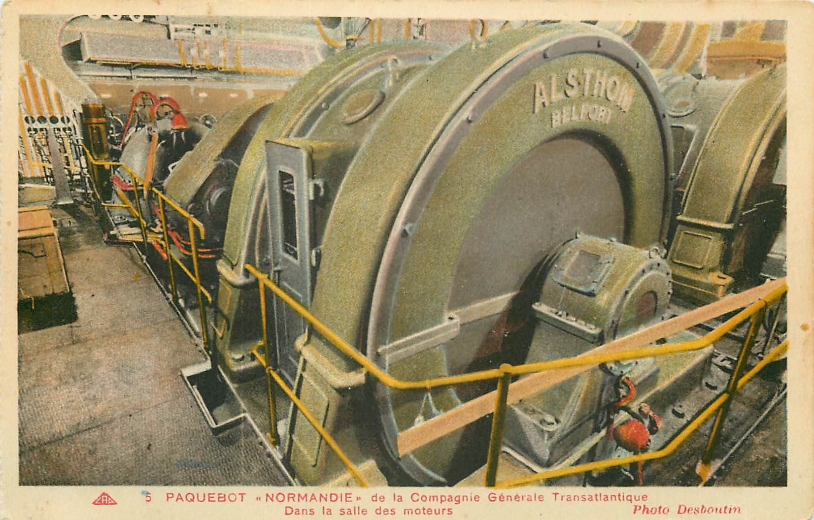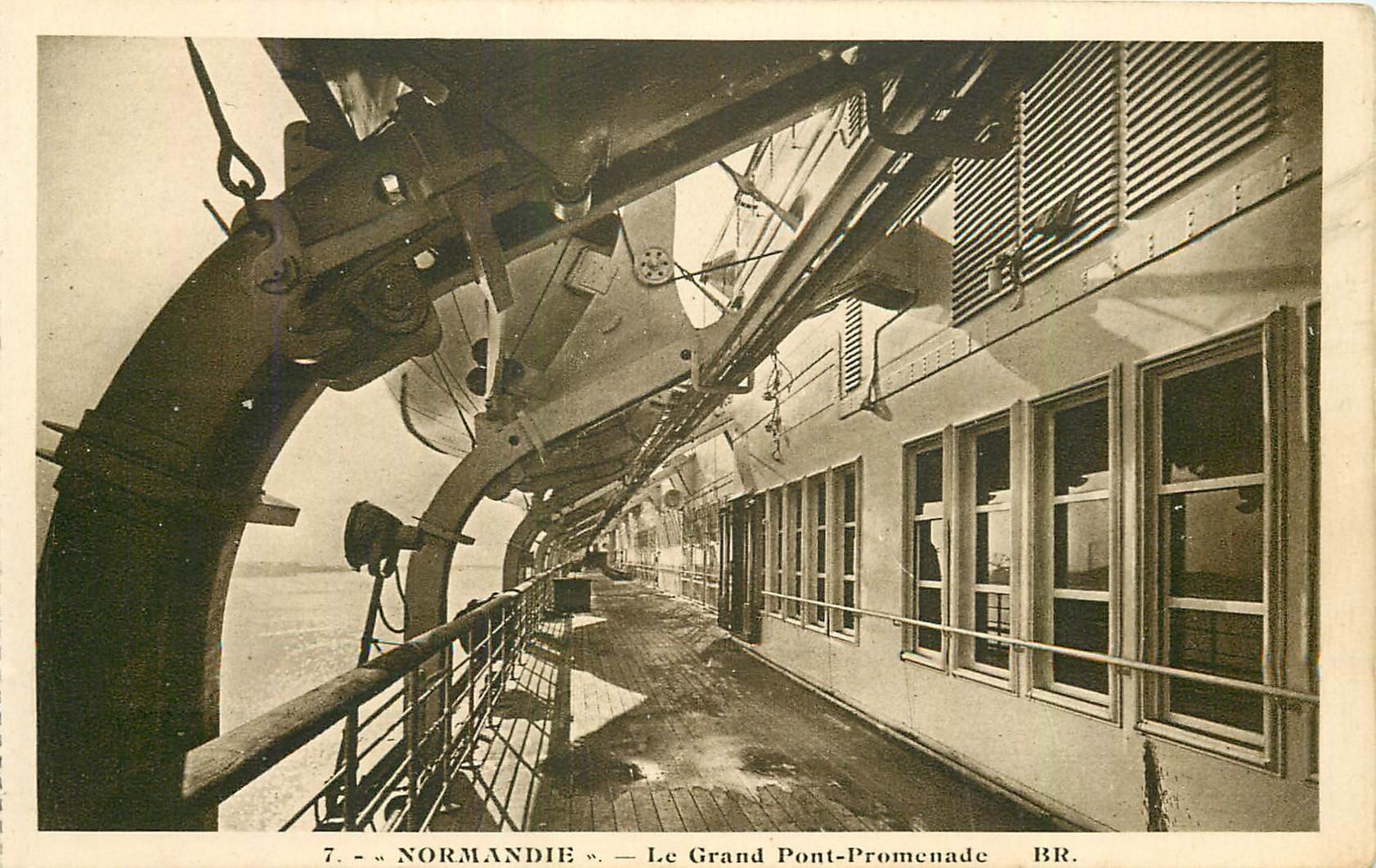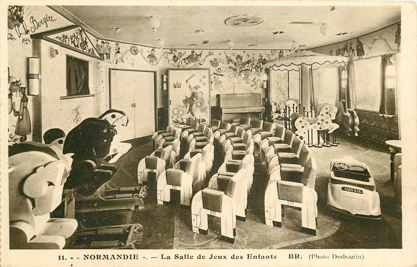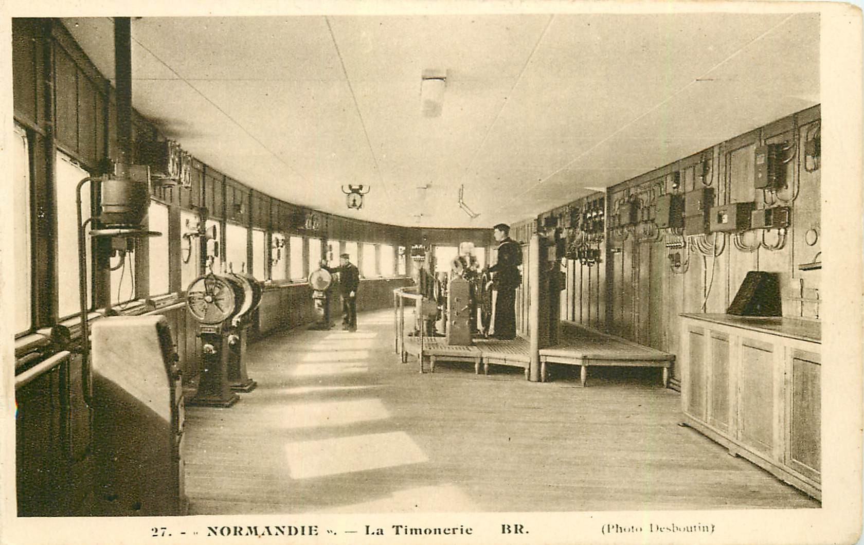 6 cpa Transatlantique NORMANDIE. Piscine, Salle Jeux, Grand Pont, Timonerie, Salle moteurs et Théâtre