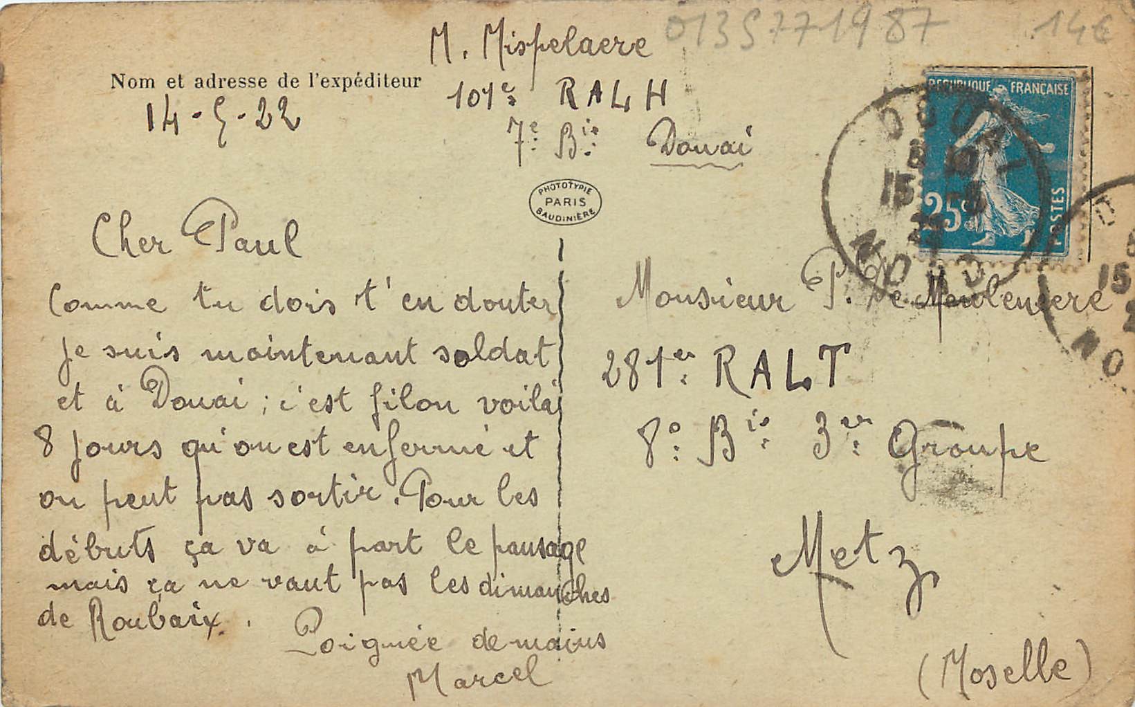 59 DOUAI. 101° Artillerie 7° Batterie au Pansage 1922