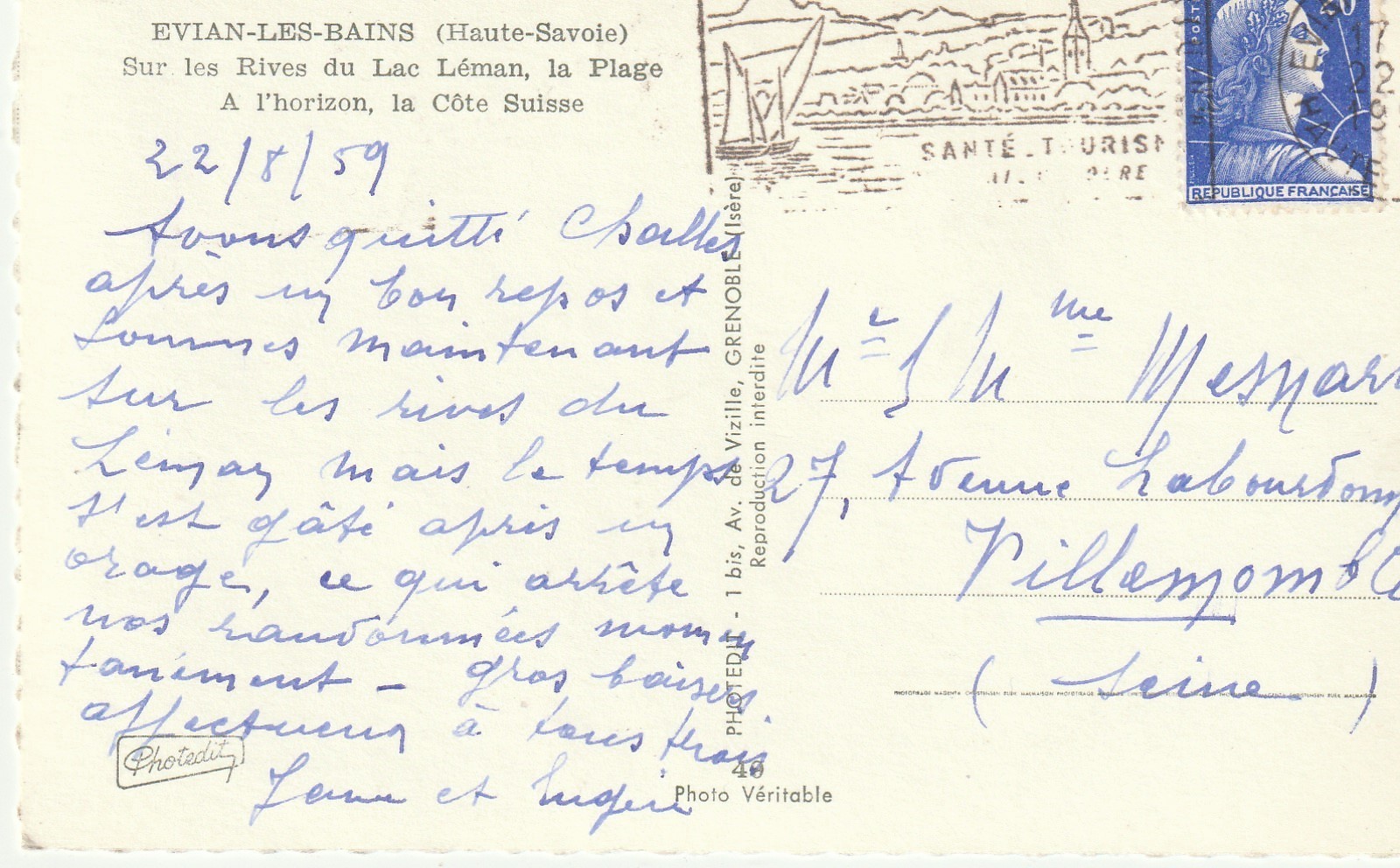 Photo Cpsm petit format 74 EVIAN-LES-BAINS. Rives du Lac Léman et la Plage Côte Suisse 1959