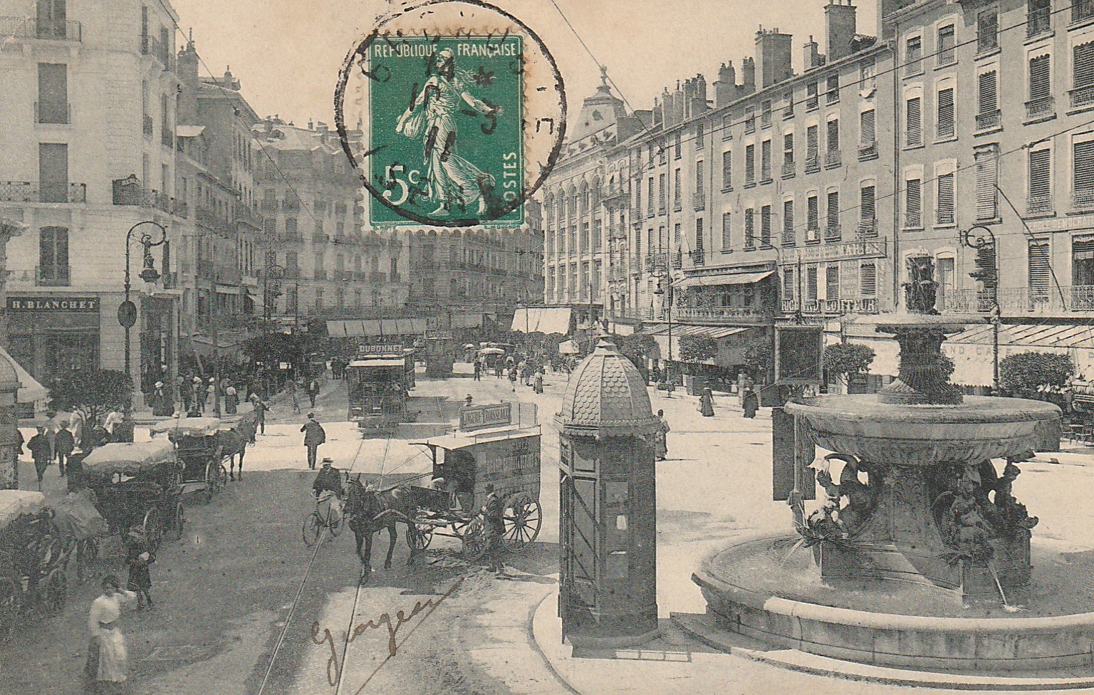 38 GRENOBLE. Fontaine du Château-d'Eau Place Grenette avec tramways et attelages 1911