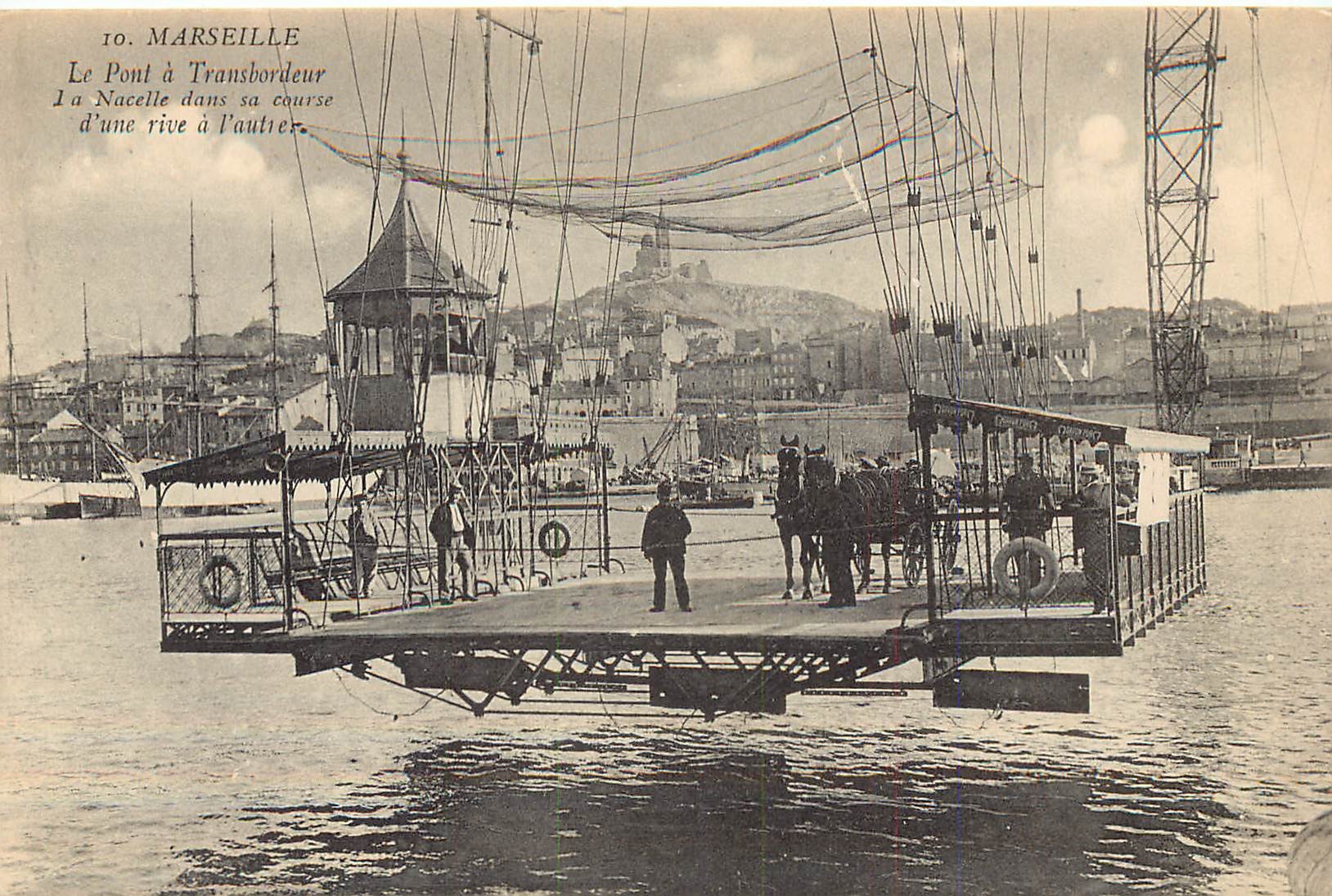 13 MARSEILLE. Le Pont à Transbordeur et la Nacelle dans sa course d'une rive à l'autre avec attelage
