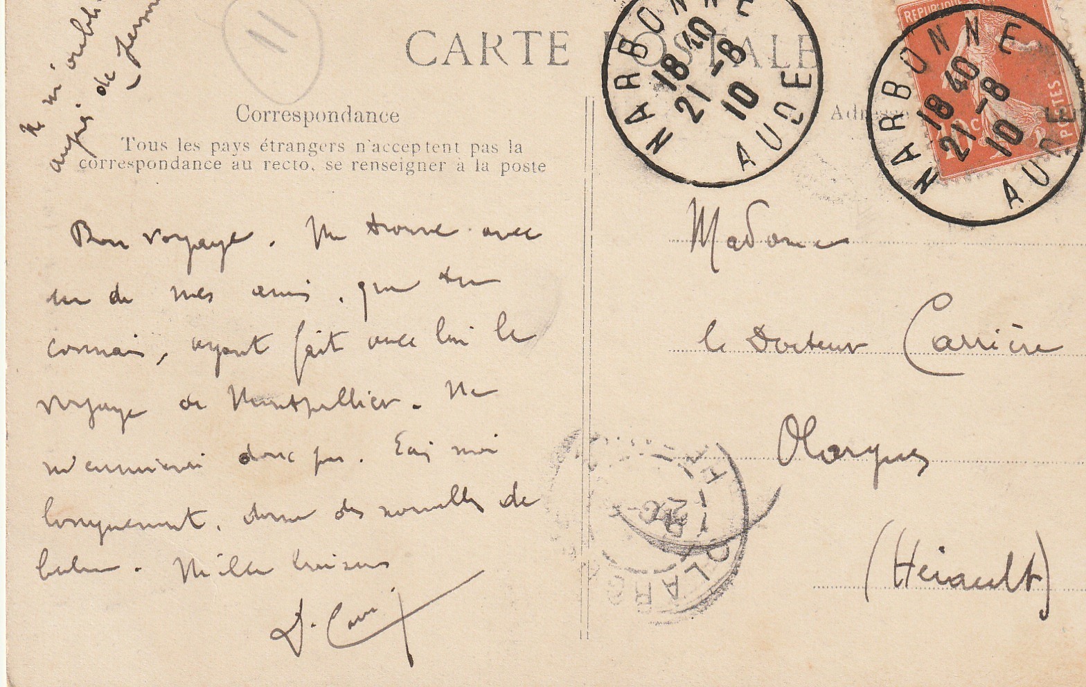carte postale ancienne 11 NARBONNE. L'Hôtellerie des Trois-Nourrices 1910. Affiche Liqueur Raspail et Pernet-Branca19,00 €