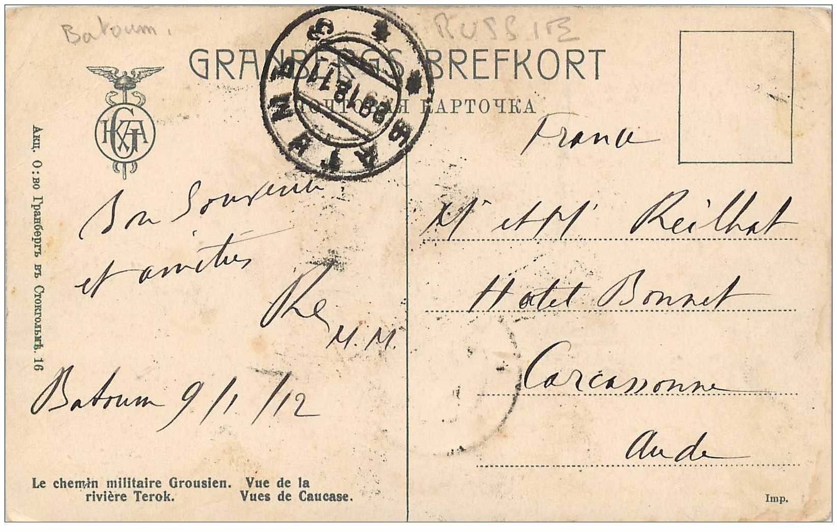 carte postale ancienne RUSSIE. Caucase Chemin militaire Grousien et Rivière Terok 1912 à découvrir sur la boutique fortunapost.com. Bon état. Les cartes postales anciennes présentes sur ce site sont des originalesDestinataire :
